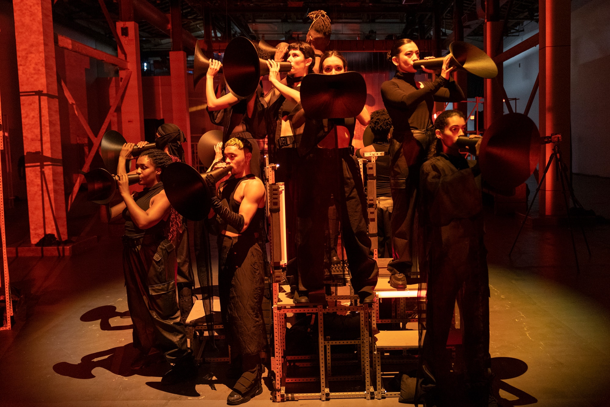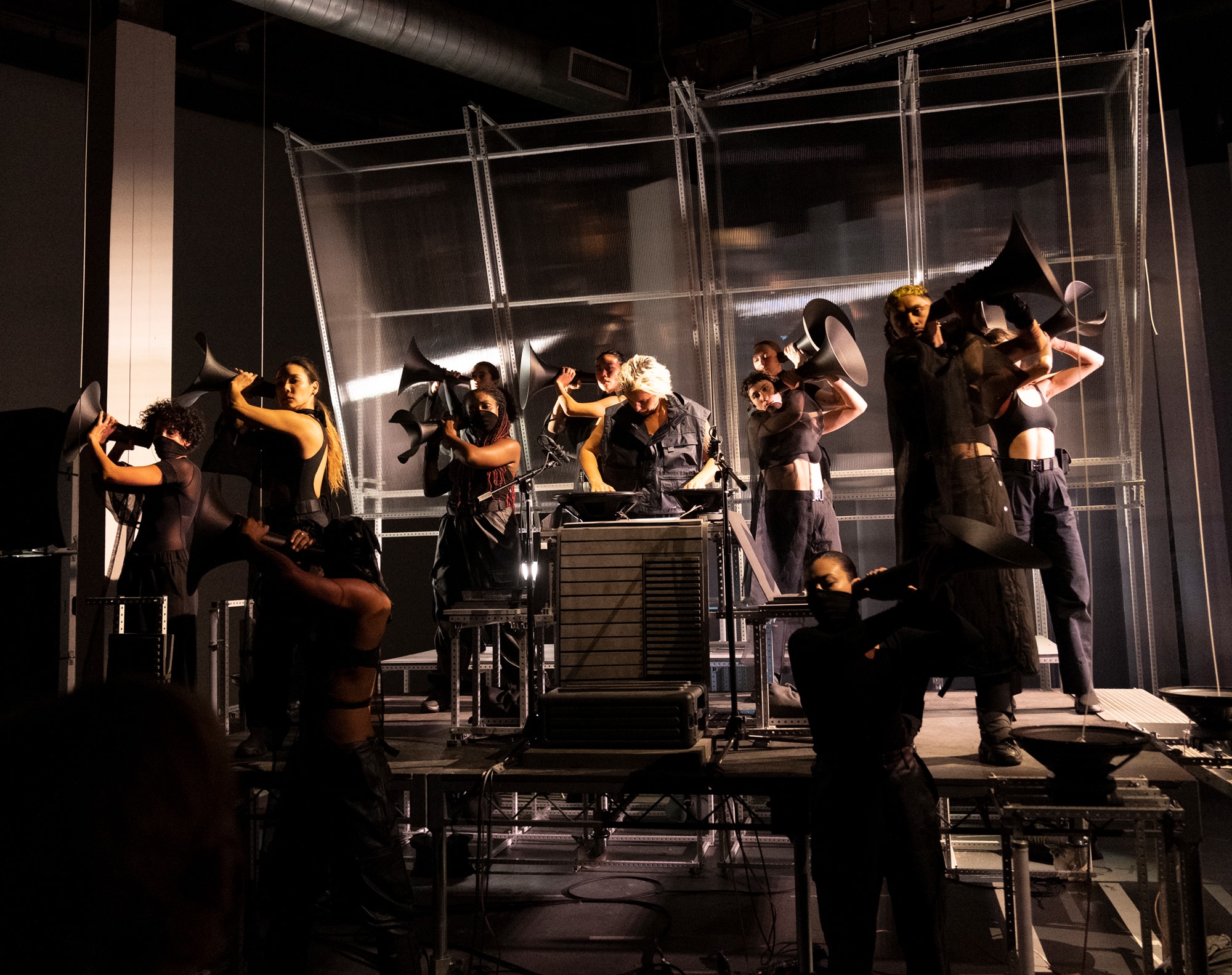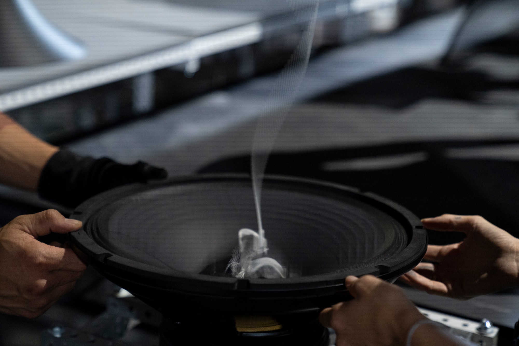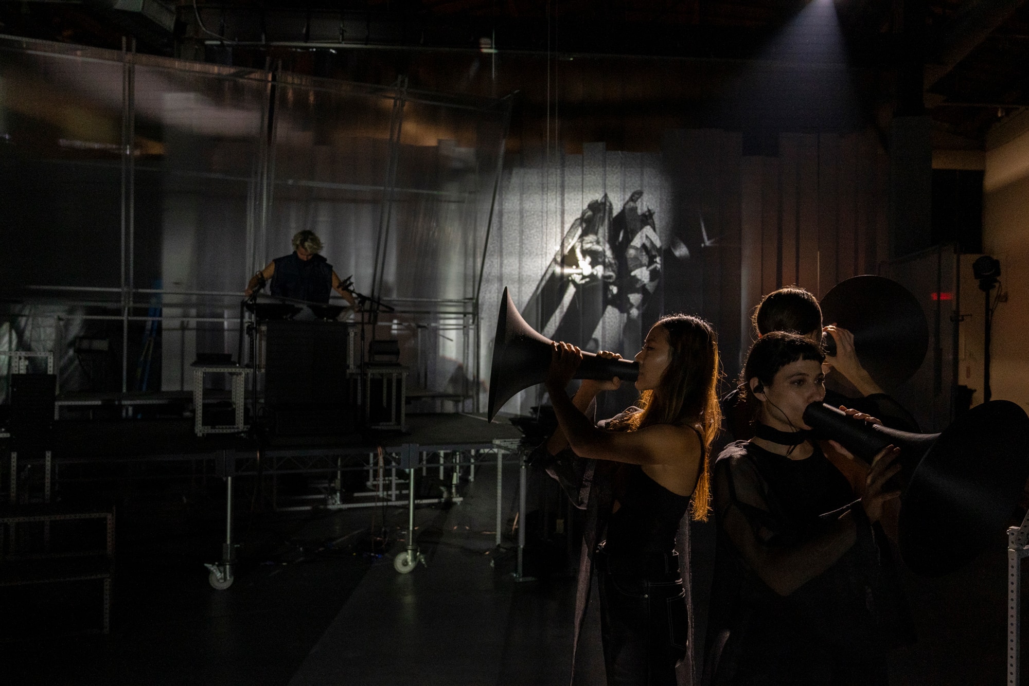 In this performance installation, The Geffen Warehouse is transformed into collective listening zones that are activated by human voices, subaudible subwoofers, architectural resonances, and psychoacoustic beats. Fure plays live on a rig of speaker cones that pulsate the air. And 14 performers with 3D-printed megaphones flock in formations throughout the crowd, modeling cooperation and sending slivers of white noise straight to the skin.