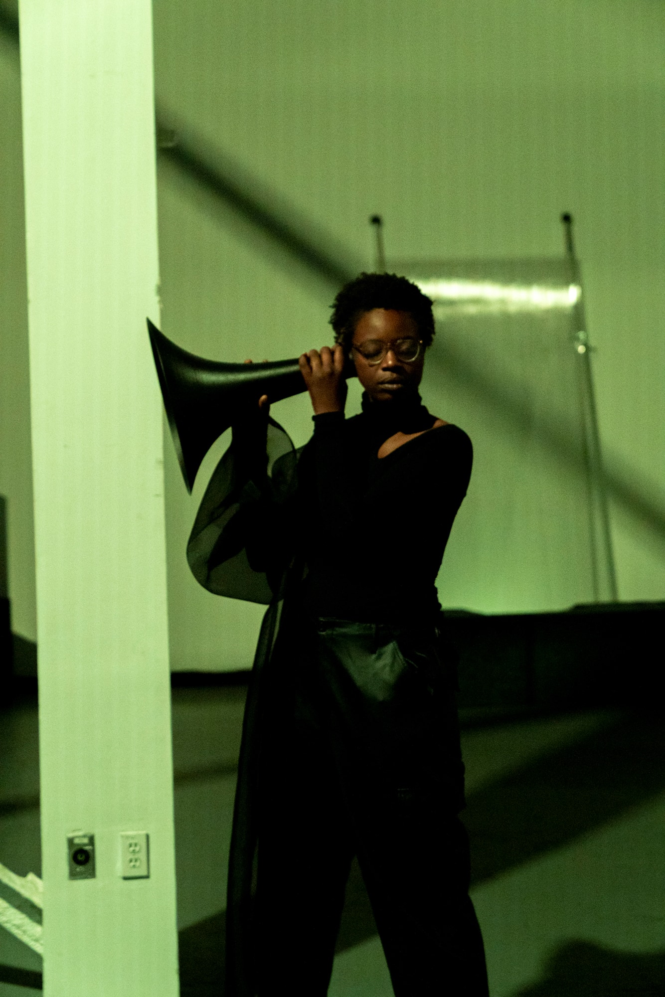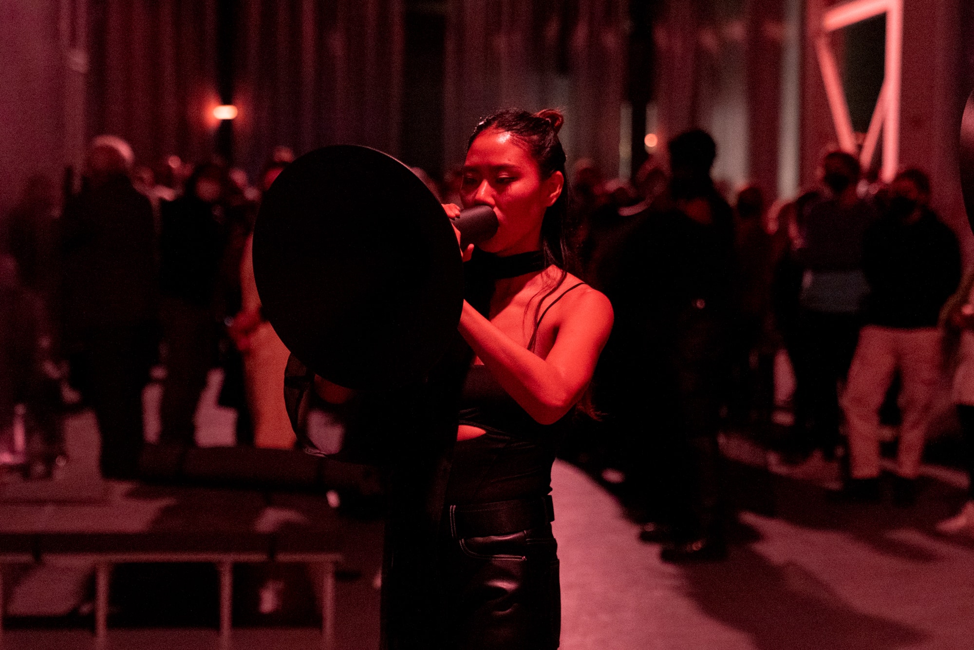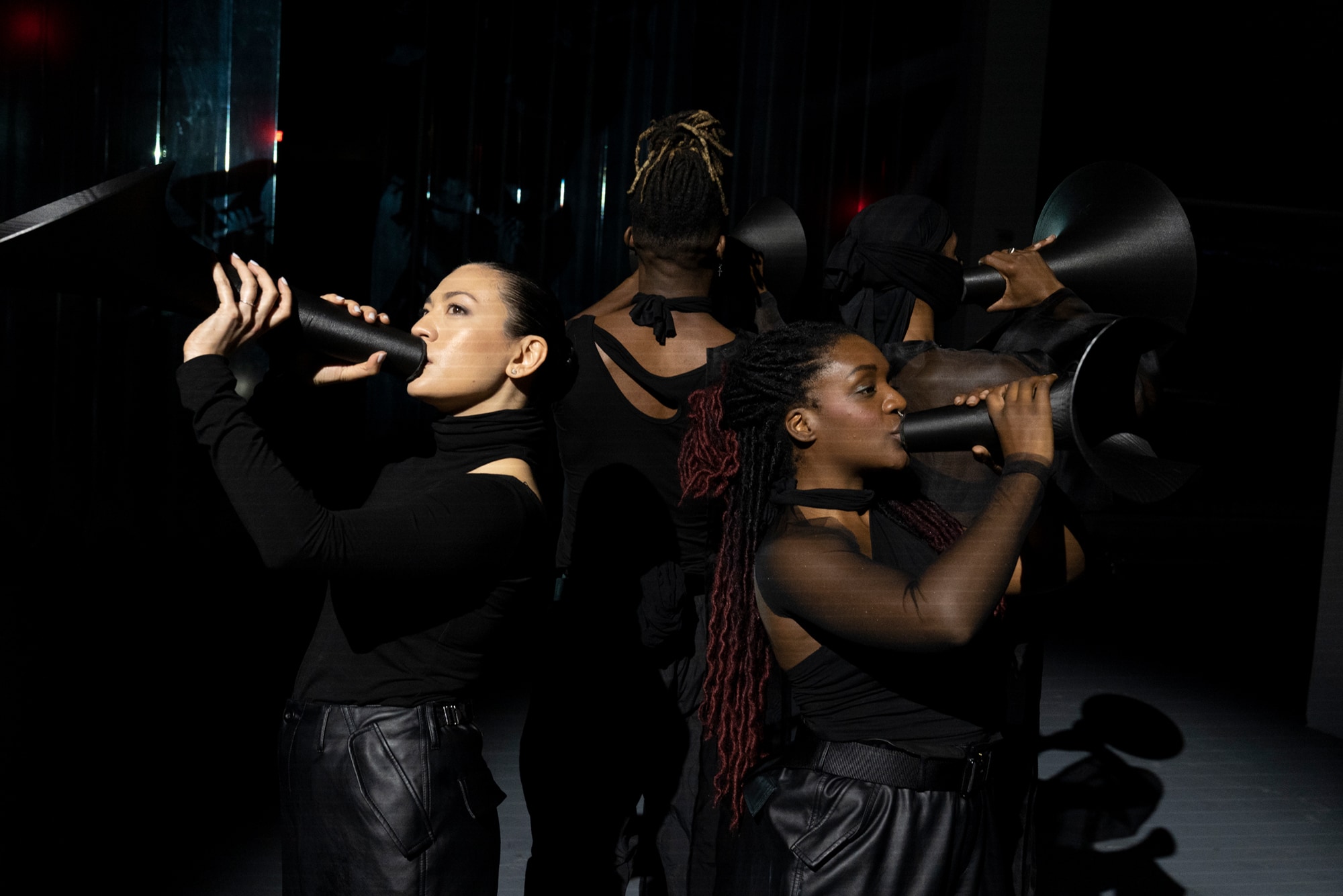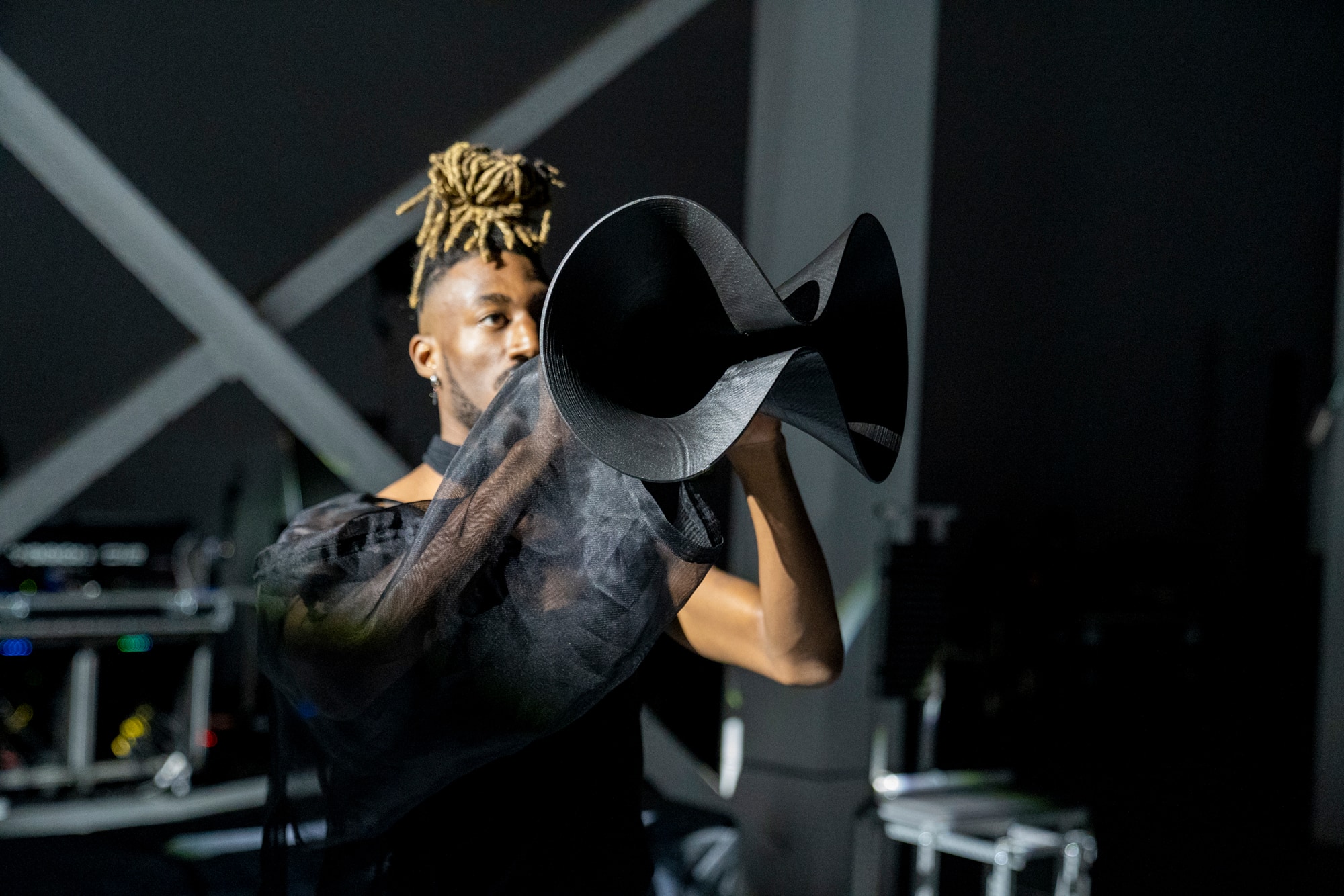 In this performance installation, The Geffen Warehouse is transformed into collective listening zones that are activated by human voices, subaudible subwoofers, architectural resonances, and psychoacoustic beats. Fure plays live on a rig of speaker cones that pulsate the air. And 14 performers with 3D-printed megaphones flock in formations throughout the crowd, modeling cooperation and sending slivers of white noise straight to the skin.