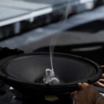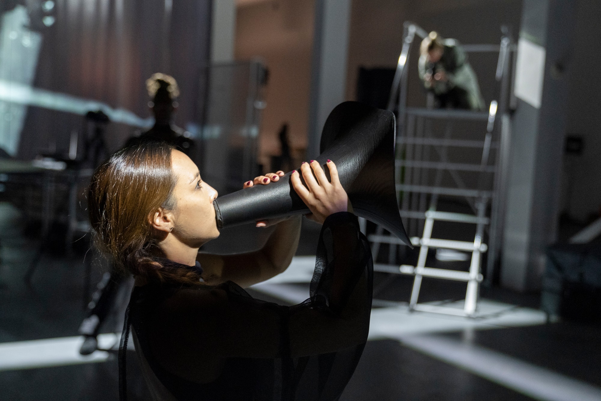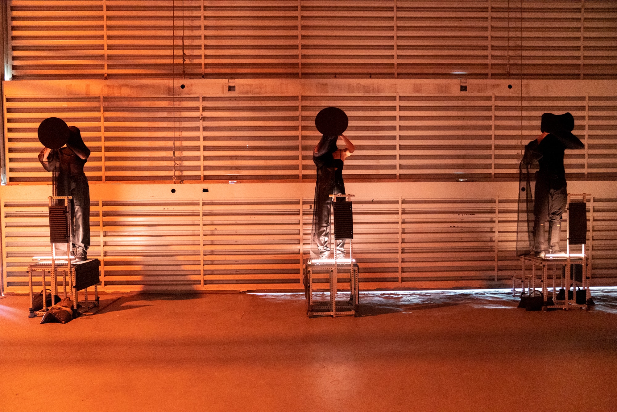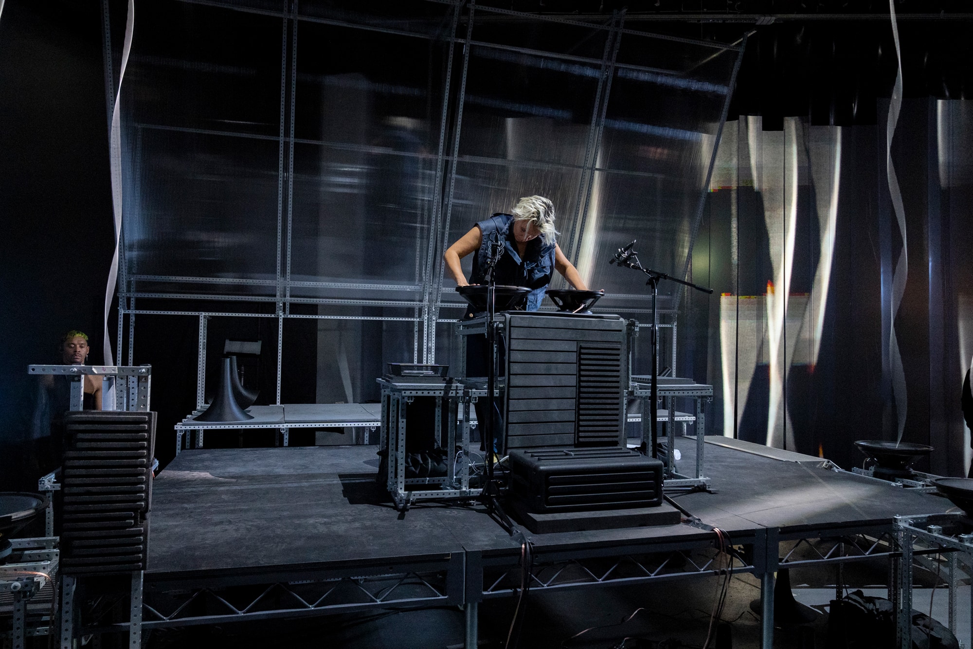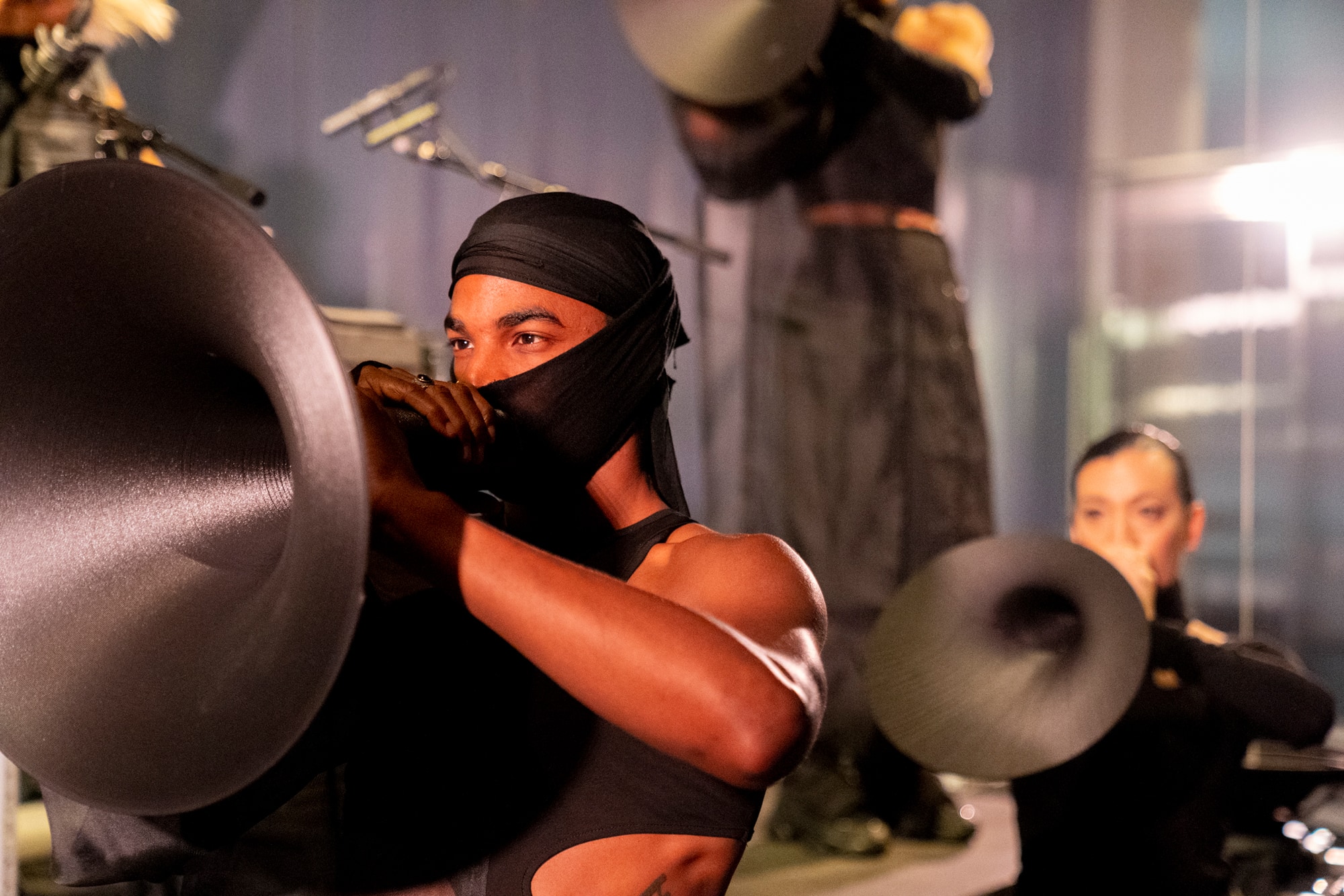 In this performance installation, The Geffen Warehouse is transformed into collective listening zones that are activated by human voices, subaudible subwoofers, architectural resonances, and psychoacoustic beats. Fure plays live on a rig of speaker cones that pulsate the air. And 14 performers with 3D-printed megaphones flock in formations throughout the crowd, modeling cooperation and sending slivers of white noise straight to the skin.